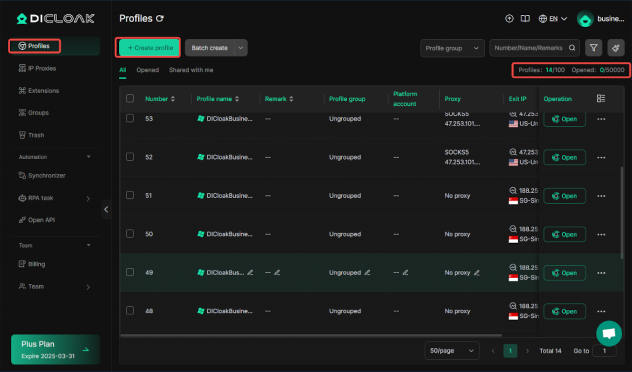 Lorsque vous utilisez DICloak, vous accédez à une interface de type navigateur dans laquelle chaque profil ou session peut être configuré avec une identité numérique unique, qui inclut des paramètres comme l’adresse IP, la géolocalisation simulée, les cookies et d’autres données techniques généralement utilisées par les sites pour reconnaître ou suivre un utilisateur.