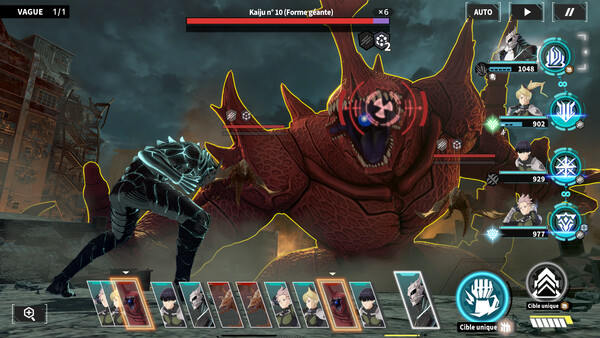 Le jeu intègre aussi une liste de personnages jouables (officiers de la Défense) issus de l’univers Kaiju No. 8, comme Kafka Hibino (qu’il incarne parfois en forme de kaiju), Mina Ashiro, Soshiro Hoshina, Kikoru Shinomiya, et d’autres. Chaque personnage dispose de compétences uniques, d’effets visuels distinctifs et de synergies possibles avec d’autres pour déclencher des attaques combinées lorsque les conditions sont réunies.