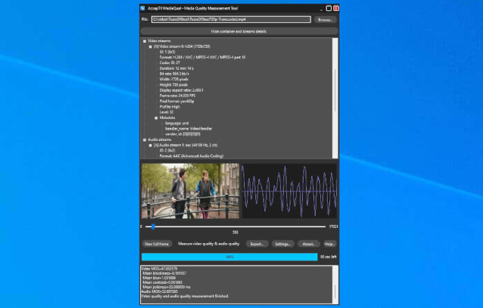 Cet outil permet de vérifier les fichiers multimédia et de mesurer la qualité vidéo et audio (QoE : Qualité d’Expérience). Il supporte les conteneurs courants (AVI, MP4, TS, MOV, WMV, PS...), ainsi que les codecs vidéo HEVC (H.265), MPEG-4/AVC (H.264), MPEG-2, et des codecs audio tels que MP3, AC3, AAC, DTS, FLAC.