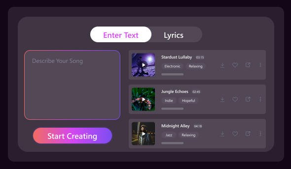 L’utilisateur peut saisir un texte ou des paroles, choisir un genre (pop, hip-hop, country, relax, énergique, etc.), sélectionner le type de voix souhaité (masculine, féminine, ou piste instrumentale uniquement) et lancer la génération.