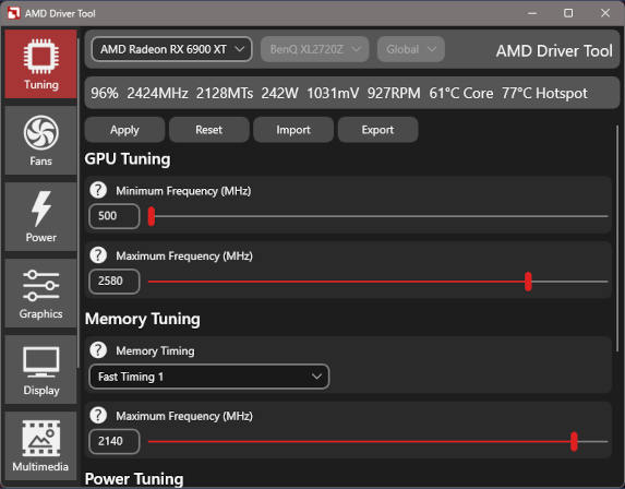 Grâce à RadeonTuner, il est possible de modifier la fréquence du GPU et de la mémoire, de régler la ventilation, de changer les paramètres d’affichage et d’importer ou d’exporter des profils de réglages à volonté.