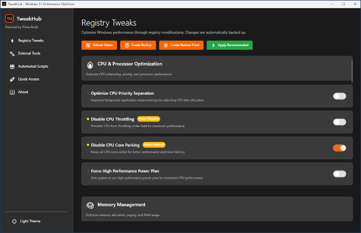 La section des Registry Tweaks (réglages de registre) rassemble des optimisations prêtes à l’emploi pour ajuster des comportements système clés. Cela couvre des aspects comme la gestion de la mémoire, la réponse du processeur à certaines tâches et l’utilisation des ressources dans différentes situations. Plutôt que de parcourir manuellement chaque clé de registre, vous pouvez sélectionner les modifications souhaitées dans TweakHub pour les appliquer automatiquement.