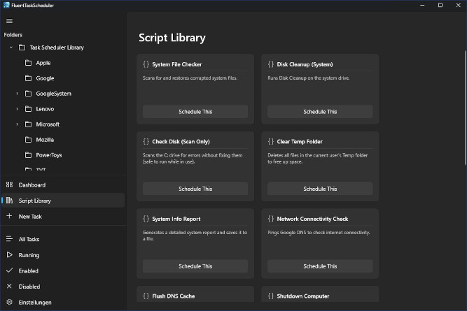 FluentTaskScheduler permet également de créer et de modifier des tâches planifiées grâce à des outils de configuration plus accessibles. Les déclencheurs peuvent être définis pour lancer une tâche à une heure précise, selon une fréquence déterminée ou en réaction à certains événements. L’application conserve les capacités du planificateur Windows tout en proposant une interface de configuration plus claire qui facilite la création et la gestion des automatisations.