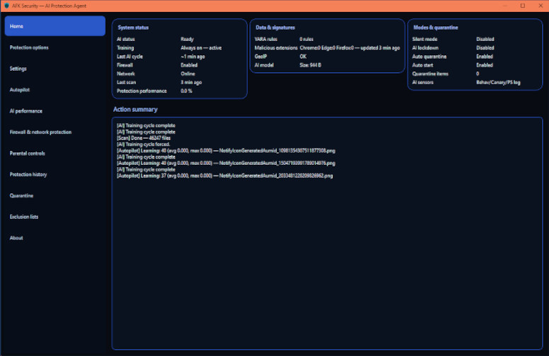 AFKSecurity intègre un système d’analyse des menaces capable d’examiner les fichiers et les comportements suspects présents sur votre machine. Ce module permet d’identifier des scripts ou des éléments potentiellement malveillants, avec pour objectif de détecter des risques avant qu’ils n’affectent le système.